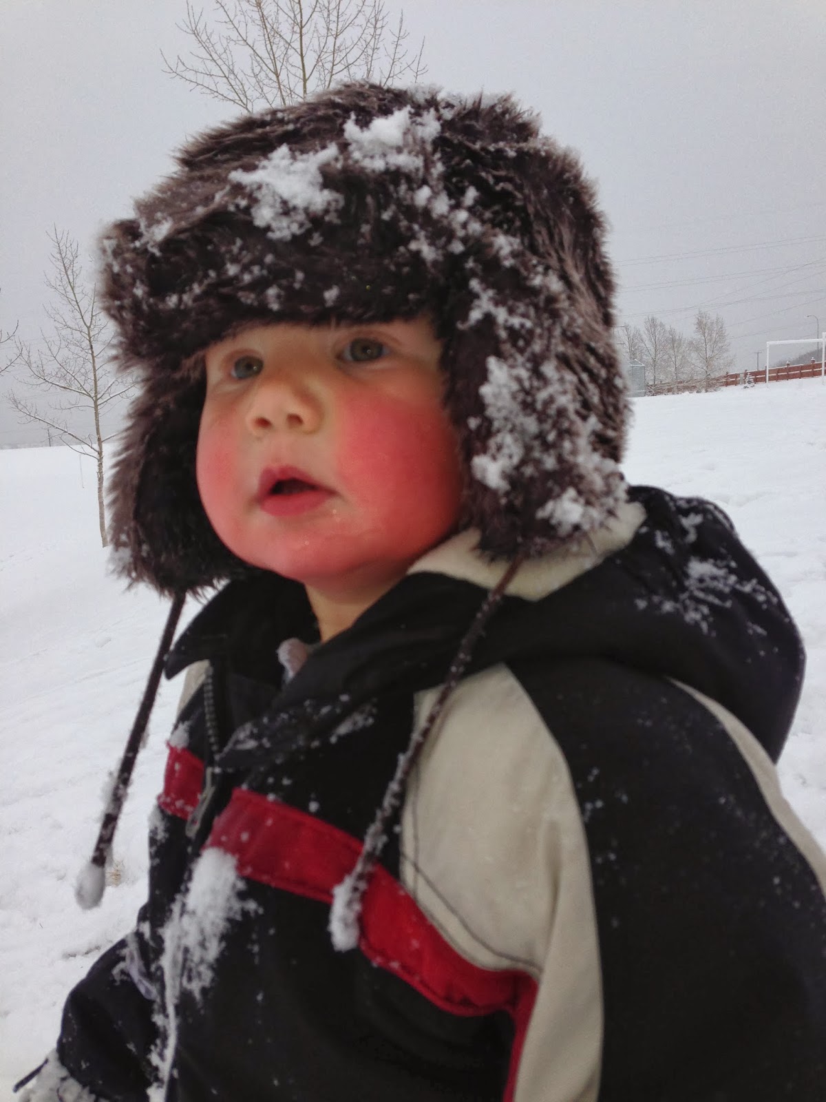 Since I took this video he has taken to using the other sled (I eventually had to go to Canadian Tire to get proper sleds. I got a green plastic toboggan and a blue saucer.) He loves the blue sled all of the sudden as it goes way faster and farther than the green toboggan! After the big kids get out of school they all come to the hill to sled. Ryder cannot wait to get up from his nap to go sledding with the "neighbourhood kids" as he calls them. I often feel like a Teacher on recess supervision, trying to manage the hill to keep it safe for both the big kids and the wee ones alike. I put on my happy, energetic voice and remind everyone to take turns and to walk up the SIDE of the hill not right up the middle...I don't want to be that "crazy parent" and since there are rarely other parents out there, or other small children Ryder's age, I think I am getting away with actually being the cool Mom of the cutest little boy. Even the older boys keep commenting how "cute" Ryder is and often they'll even carry his sled up the hill for him! Actually, that is the awesome thing about Ryder. He insists on carrying his sled himself (unitl he gets tired) and he always walks up the hill himself excited to "try that again." I don't mind holding his hand on the way up to keep him from slipping but if he ever asks me to carry him, I know it's time to head home as he's just too tired to keep going. I get ridiculous amounts of joy out of watching and listening to Ryder sled!! In the mornings, all the big kids are at school so we often have the hill to ourselves. Scout comes and so does Payton and we all race up and down the hill soaking up as much Winter fun as possible!!!